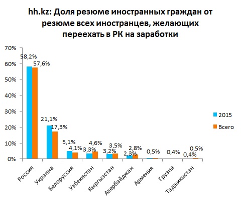 Подтверждают сказанное и данные службы исследований компании HeadHunter Казахстан в 2015 году, согласно которым заметно увеличилось количество резюме россиян, а также граждан Украины и Беларуси, желающих работать в Казахстане.