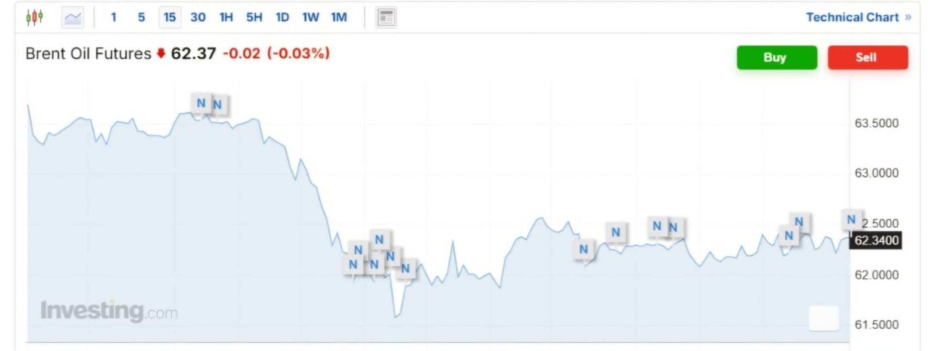 Цена декабрьских фьючерсов на нефть марки Brent незначительно понизилась на 0,03 процента - до 62,37 доллара за баррель.