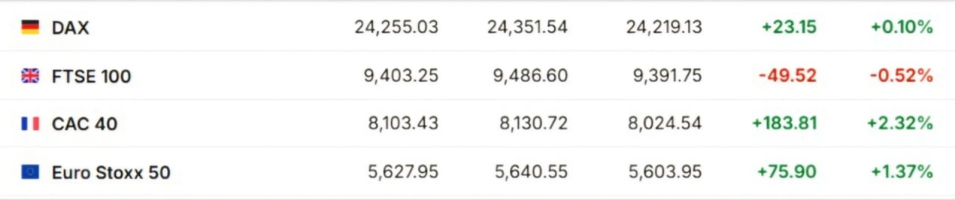 Из основных индексов Euro Stoxx 50 (+1,37 процента, включает 50 крупнейших и наиболее ликвидных компаний стран еврозоны), DAX (+0,10 процента, Германия), CAC 40 (+2,32 процента, Франция) показали рост. При этом FTSE 100 (-0,52 процента, Великобритания) снизился.