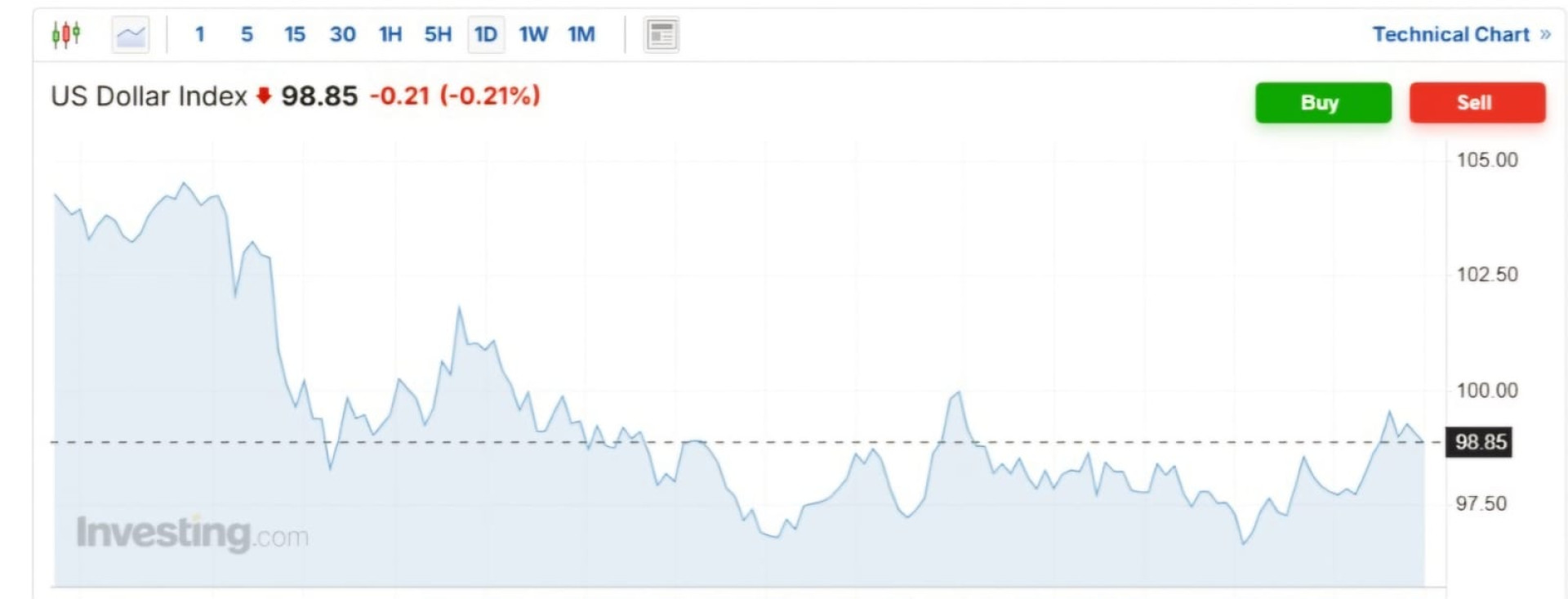 Индекс доллара США (U.S. Dollar Index, DXY, курс доллара по отношению к корзине основных мировых валют: евро, иена, фунт, канадский доллар, шведская крона, швейцарский франк) ослаб на 0,21 процента.
