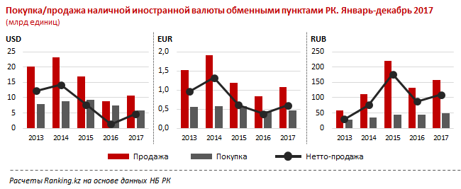 Примечательно, что нетто-продажа (продажа валюты минус покупка) обменными пунктами за 2017 год составила 4,7 миллиарда долларов, что почти в 3,5 раза больше, чем за 2016 год, когда объем нетто-продажи составил самый низкий показатель за последние десять лет - 1,4 миллиарда долларов (-82,3 процента за год).