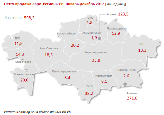 У евро за январь-декабрь 2017 года во всех регионах РК также положительные нетто-продажи. За 2016 год отрицательные нетто-продажи обменных пунктов были в двух из 16 регионов РК.