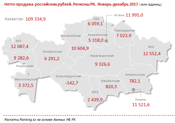 Самые высокие положительные нетто-продажи обменных пунктов российских рублей - в приграничных ВКО и ЗКО - 12,6 миллиарда рублей (+25 процентов) и 12,1 миллиарда рублей (+20,1 процента) соответственно. Замыкает тройку лидеров Алматы - 12 миллиарда RUB, рост за год на 9 процентов.