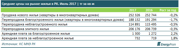 Цены на жилье в сравнении с прошлогодними снизились практически по всем сегментам рынка, однако сильнее всего - для вторичного жилья (сразу минус 1,7 процента за год, до 188,1 тысячи тенге за квадратный метр по итогам июля). Для сравнения, стоимость "квадрата" в новостройках снизилась всего на 0,2 процента год-к-году, до 252,3 тысячи тенге.