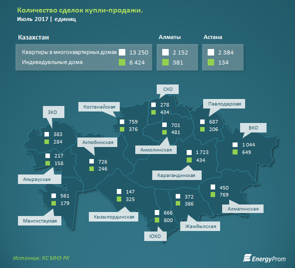 Только за месяц было заключено 19,5 тысячи сделок купли-продажи недвижимости, что на 26 процентов больше, чем год назад. Всего за первое полугодие объем услуг, связанных с недвижимым имуществом, достиг 390,35 миллиарда тенге. Это на 7,8 процента больше, чем в аналогичном периоде прошлого года.