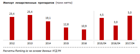 C 2013 года объем ввозимых в РК лекарственных средств в стоимостном выражении уменьшился на 49 процентов, в физическом объеме на 57 процентов. За 2016 год медикаментов было завезено на 602,5 миллиона долларов, в 2015 - на 847,6 миллиона долларов.