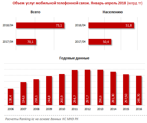 По данным аналитиков, за четыре месяца текущего года мобильные операторы оказали услуги на 73,1 миллиарда тенге. Из них почти 71 процент - услуги, оказанные населению: 51,8 миллиарда тенге (на 2,8 процента больше, чем годом ранее). До этого, с 2013 по 2017 год, в сегменте наблюдался постоянный спад.