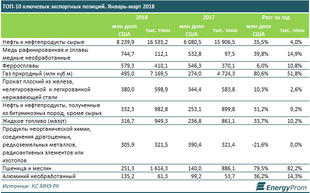 За первый квартал Казахстан экспортировал продукции на 13,8 миллиарда долларов - это на 27 процентов больше, чем годом раннее.