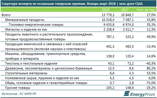 За первый квартал Казахстан экспортировал продукции на 13,8 миллиарда долларов - это на 27 процентов больше, чем годом раннее.
