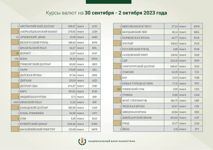 Национальный банк Казахстана опубликовал официальные курсы иностранных валют к тенге на 30 сентября - 2 октября, передает корреспондент Tengrinews.kz.