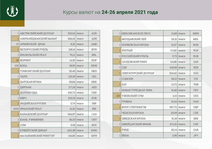 В выходные и понедельник курс доллара к тенге будет составлять 430,73 тенге. Напомним, официальный курс доллара на 23 апреля составляет 432,21 тенге.