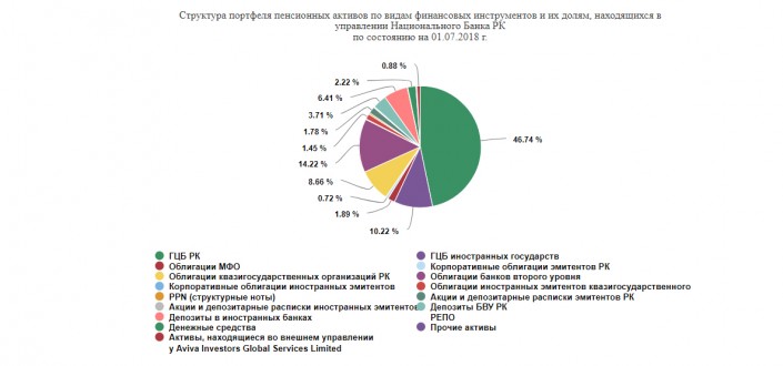 Отметим, что в целях обеспечения сбалансированного уровня доходности в долгосрочной перспективе Нацбанк в своей инвестиционной стратегии придерживается концепции диверсифицированного инвестиционного портфеля, который состоит из различных финансовых инструментов. Всего по состоянию на 1 июля 2018 года пенсионные активы ЕНПФ составили 8,45 триллиона тенге.