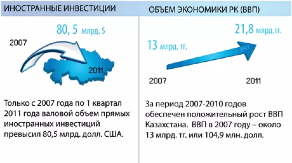 Заделы для этого уже есть. В первом полугодии 2011 года по программе ФИИР уже введено в эксплуатацию 227 проектов на сумму 914 миллиардов тенге, к концу года планируется запустить еще 129 проектов на сумму 617 миллиардов тенге. "Дорожная карта бизнеса - 2020" сегодня оказывает поддержку более 600 предприятиям, на которых заняты свыше 67 тысяч человек. Финансирование научных исследований в 2011 году по сравнению с 2007 годом увеличено в 1,8 раза. Произведен ремонт свыше 5 тысяч километров дорог.