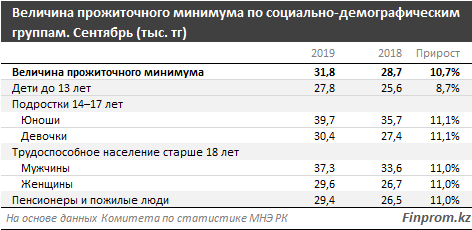 У трудоспособного населения старше 18 лет величина прожиточного минимума выглядит следующим образом: для мужчин - 37,3 тысячи тенге (годом ранее - 33,6 тысячи тенге), для женщин - 29,6 тысячи тенге (годом ранее - 26,7 тысячи тенге). Прожиточный минимум для пенсионеров и пожилых людей составил 29,4 тысячи тенге (годом ранее - 26,5 тысячи тенге).