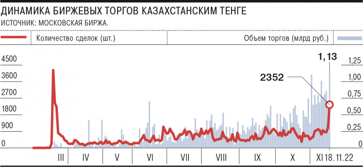 Растет интерес к тенге и со стороны частных инвесторов, которые после объявления о частичной мобилизации активно уезжали из РФ, в том числе в Казахстан. Но, как считает Валерий Емельянов, физические лица "не очень активно используют биржу для конвертации, тем более экзотических валют".