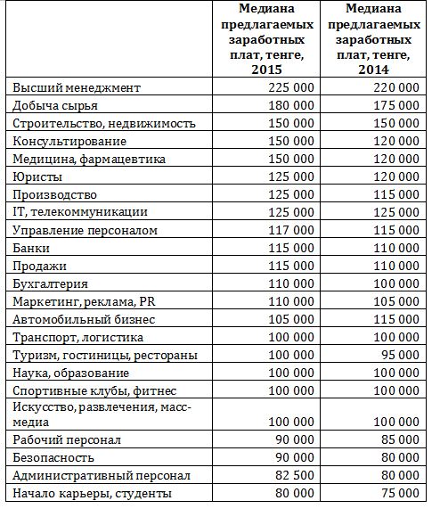 В целом, по ее словам, общая средняя предлагаемая работодателем зарплата в 2015 году: для соискателей из высшего менеджмента - 225 тысяч тенге, в сфере добычи сырья - 180 тысяч тенге, в отраслях строительство/недвижимость, консультирование и медицина/фармацевтика - по 150 тысяч тенге.