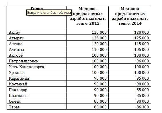 Что касается предлагаемых зарплат, то они стали выше в среднем на 3-5 процентов, считает эксперт. "Сейчас среднестатистический работодатель в Алматы в вакансиях в среднем готов предложить соискателю зарплату в размере 110 тысяч тенге, что на 4,8 процента выше прошлогоднего показателя, в Астане - 120 тысяч тенге (выше, чем в 2014 году на 4,3 процента). Наивысший показатель предлагаемого среднего ежемесячного заработка отмечен в 2015 года в Актау - 125 тысяч тенге (выше, чем в 2014 году на 4,2 процента), и Атырау - 123 тысячи тенге (ниже, чем в 2014-м на 1,6 процента)", - пояснила Быченко.