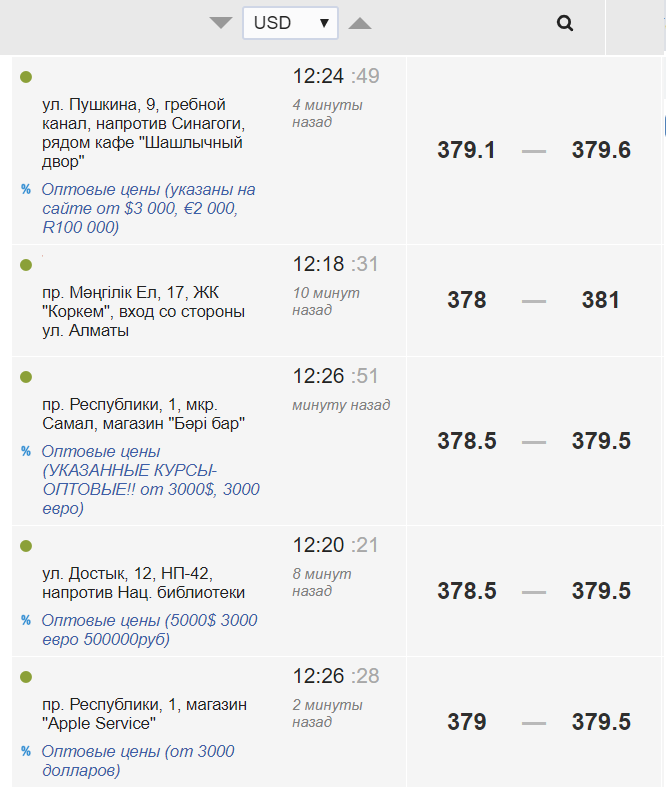 В обменных пунктах Нур-Султана и Алматы, по данным kurs.kz, американскую валюту продают от 379,5 до 381 тенге.