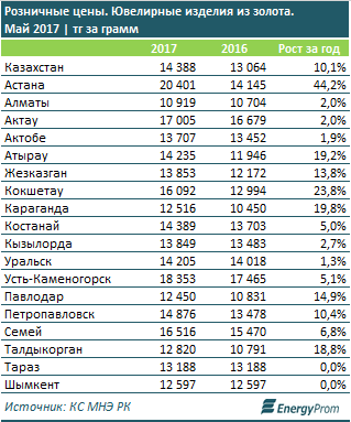 По итогам мая в розничных точках продаж цены на ювелирные изделия из золота для казахстанцев подорожали на 10,1 процента за год, до 14,4 тысячи тенге за грамм.