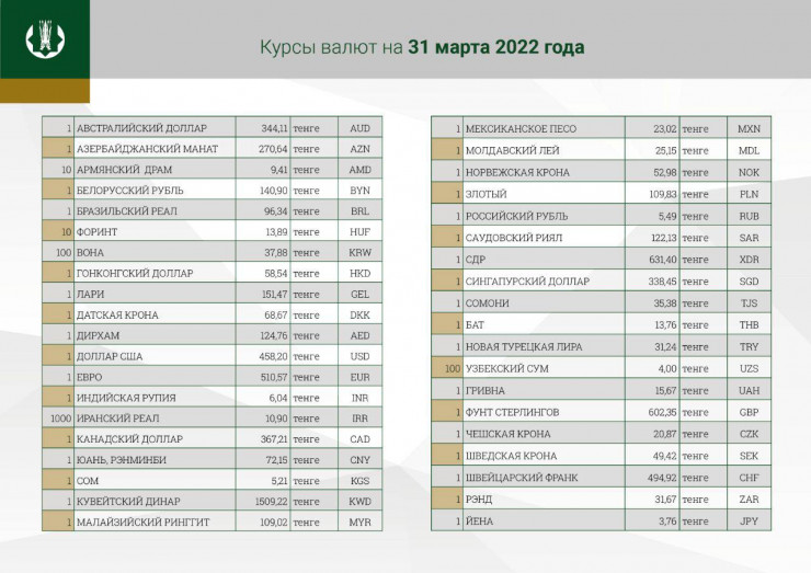 В четверг курс доллара будет равен 458,20 тенге. Отметим, что официальный курс американской валюты на 30 марта составляет 471,30 тенге.
