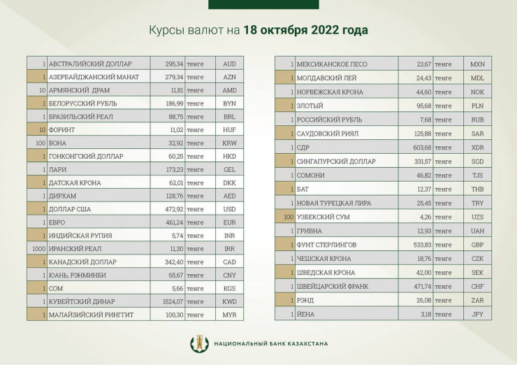 Национальный банк Казахстана установил официальные курсы доллара и рубля к тенге на 18 октября, передает корреспондент Tengrinews.kz.