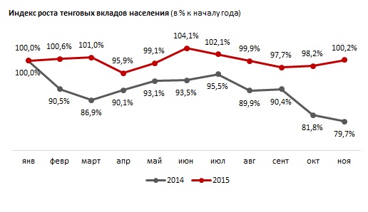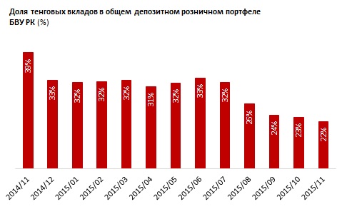 "В 2014 году динамика изменения объема тенговых вкладов физлиц была более нервной, сказывалось избыточное давление девальвационных ожиданий. В результате за 11 месяцев 2014 года депозитный розничный портфель потерял 20,3 процента в размерах. При этом уровень долларизации розничного рынка вкладов в РК продолжает расти. Если годом ранее в структуре депозитов населения доля вкладов, номинированных в нацвалюте, составляла 39 процентов, то к началу декабря 2015 года доля таких вкладов снизилась на 17 процентов - до 22 процентов", - сообщает издание.