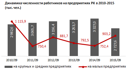 "Под давлением усиления кризисных явлений в экономике численность работников на крупных и средних предприятиях достигла минимального уровня за последние 5 лет в 2,7 миллиона человек по состоянию на конец третьего квартала 2015 года, сократившись за год на 18 процентов. При этом число рабочих мест на малых предприятиях показало рост за год на 20 процентов, приблизившись к рекордным уровням, достигнутым в 2010 году, - отметили аналитики.  - На этом фоне объем трудовых ресурсов, задействованных в малом бизнесе РК, увеличился до 33 процентов от численности работников крупных и средних предприятий".
