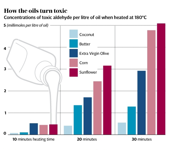 Так, профессор химии Мартин Грутвелд (Martin Grootveld) отмечает, что традиционное английское блюдо Fish and Chips (рыба с картошкой), жаренное на подсолнечном масле, содержит в 100-200 раз больше токсичных альдегидов, чем безопасный уровень, установленный ВОЗ.