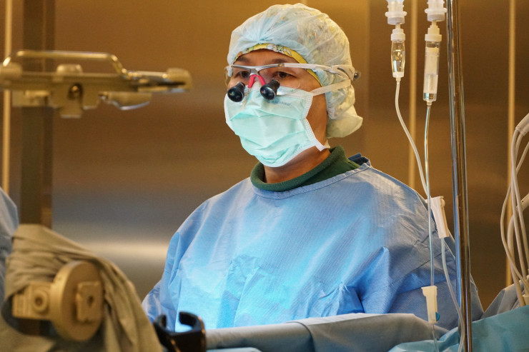 Хирург проверяет настройку микрохирургических очков для операции на пальцах