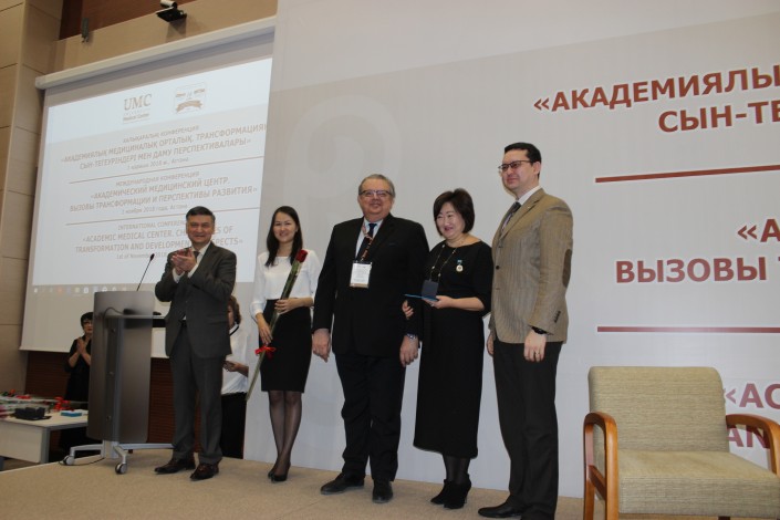 Участников конференции поздравили вице-министр здравоохранения РК Олжас Абишев, провост АОО "Назарбаев Университет" Адесида Илесанми, вице-президент по медицине - декан Школы медицины АОО "Назарбаев Университет" Массимо Пиньятелли, медицинский и научный директор UPMC International Бруно Гриделли, председатель правления UMC Жаксыбай Жумадилов и другие.