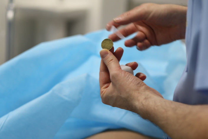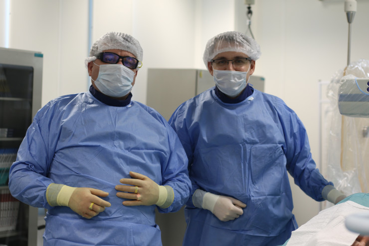 "Параллельно мелким сосудам разрастаются нервные волокна, плюс происходит выделение различных медиаторов (посредников) воспаления, которые играют роль в самом дегенеративном процессе, то есть в процессе разрушения ткани. Мы эмболизируем, препятствуем чрезмерному кровотоку и устраняем нервную сеть. Понятно, что, в отличие от травматологов-ортопедов, мы не заменяем сустав, не делаем его новым, наша основная цель - повысить качество жизни пациента и избавить от боли", - отмечает доктор Евгений Хайрутдинов и, перед тем как вместе с коллегами приступить к очередной операции, выполняет один хирургический ритуал: крепит монету на колене пациента.