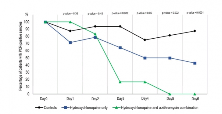 На шестой день терапии 70 процентов пациентов, получавших гидроксихлорохин, по результатам вирусологических исследований были полностью здоровы. При этом от коронавируса избавились все испытуемые, дополнительно к гидроксихлорохину получавшие антибиотик. В контрольной группе доля излечившихся за это же время составила 12,5 процента.