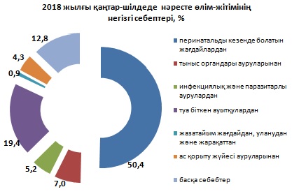 Комитеттегілердің айтуына қарағанда, бұл тіркелген өлім-жітімнің негізгі себебі - перинаталдық кезеңде пайда болатын жағдайлар. Бұл себептерден 957 нәресте қайтыс болып, 1 жасқа дейінге балалар арасындағы жалпы өлім санының 50,4 пайызын көрсетті. Сонымен қатар, туа біткен ауытқулардан - 368 (19,4 пайыз), тыныс органдары ауруларынан - 132 (7 пайыз), инфекциялық және паразитар аурулардан - 99 (5,2 пайыз) және жазатайым жағдайдан, уланудан және жарақаттан 82 (4,3 пайыз) нәресте шетінеп кеткен.