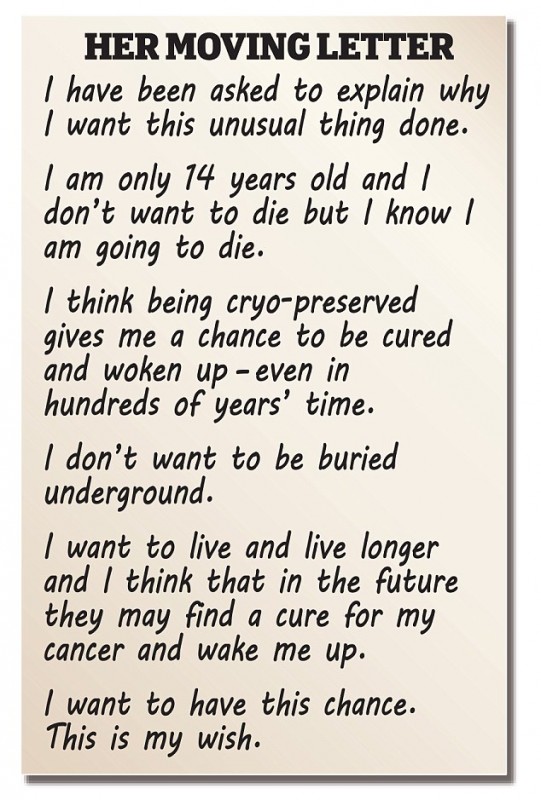 В своем прощальном письме школьница написала: "Мне всего 14 лет, и я не хочу умирать, но я знаю, что умираю. Не желаю, чтобы меня хоронили под землей. Я думаю, что криоконсервация даст мне шанс вылечиться, проснувшись пусть даже через сотни лет. Хочу жить. Хочу, чтобы у меня был этот шанс".