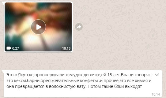 На видеоролике пугающего содержания видно, как группа врачей извлекает из брюшной полости пациента некое инородное тело. В описании ролика сообщается, что на операционном столе находится маленькая девочка. Якобы она была вынуждена лечь под нож из-за чрезмерной любви к конфетам, кексам и прочей сладости.