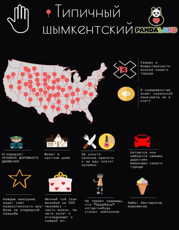 Самые популярные представители казахской нации всегда были "притчей во языцех". Тем не менее, шымкентские захватывают все уголки Казахстана, знакомя всех со своими правилами жизни. Из всех фактов про представителей южного региона портал Pandaland.kz выбрал самые правдоподобные. Так ли это, смотрите в новой инфографике про "Типичного Шымкентского".