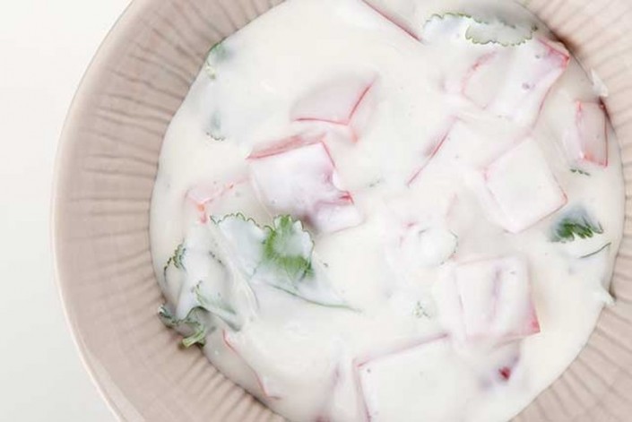 3. Крупно порубите кинзу, смешайте с йогуртом, добавьте сок лимона, соль и порезанный перец. Перемешайте.