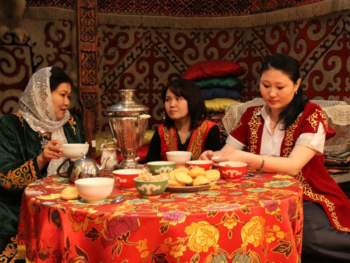 9. Когда сытые и довольные гости, наконец, расходятся, то от хозяйки дома можно услышать привычное: "Ал енді өзіміз шәй ішейік" (а теперь сами попьем чай). Тогда к старшим присоединяются все келинки и начинается чаепитие в кругу своих.