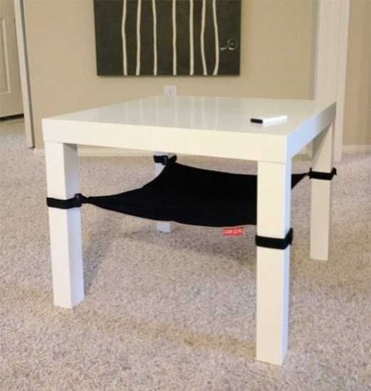 Как сделать так, чтобы кот не болтался постоянно под ногами и в то же время, как и положено хищнику, мог наблюдать за всем происходящим вокруг? Очень просто: сделайте для него специальное место в виде гамака под табуретом или стулом. Вам понадобится для этого только кусок материи с четырьмя пришитыми по углам лентами.