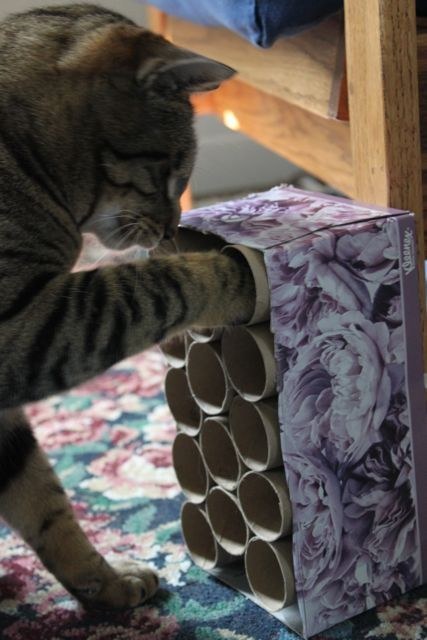 Иногда для веселья достаточно совершенно простых вещей. Например, эти ролики из-под туалетной бумаги, плотно помещенные в коробку из-под обуви, развлекут не только кота, но и вас. Пока он проверяет, не прячется ли в каждой норке по мышке, вы сможете сделать несколько удачных кадров.