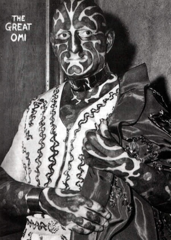 Хорас Ридлер, известный по прозвищам Великий Оми, или Человек-зебра, был профессиональным уродцем и актером интермедии. С головы до ног он был покрыт черно-белыми полосами. Чтобы подчеркнуть свои татуировки, Ридлер красил губы и ногти в черный цвет.