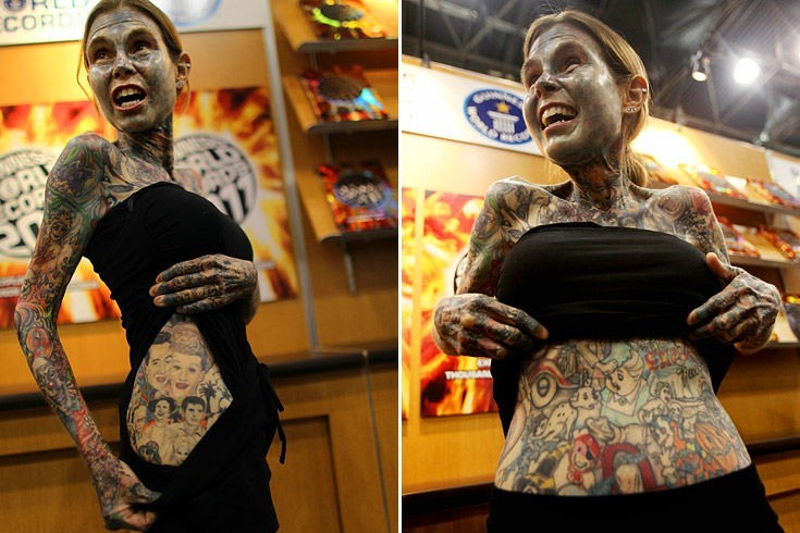 Джулия Гнусе попала в Книгу рекордов Гиннесса как самая татуированная женщина в мире. Татуировки покрывают 95 процентов ее тела. Однако увлекаться татуировкой она начала не по своей воле. Дело в том, что Джулия страдает от редкого заболевания под названием порфирия - ее кожа чрезвычайно чувствительна к солнечному свету, попадание его на кожу приводит к появлению рубцов. Врач Джулии порекомендовал ей сделать боди-арт по всему телу с чернилами под цвет ее шрамов. Гнусе согласилась и вскоре тату превратилось в навязчивую идею.