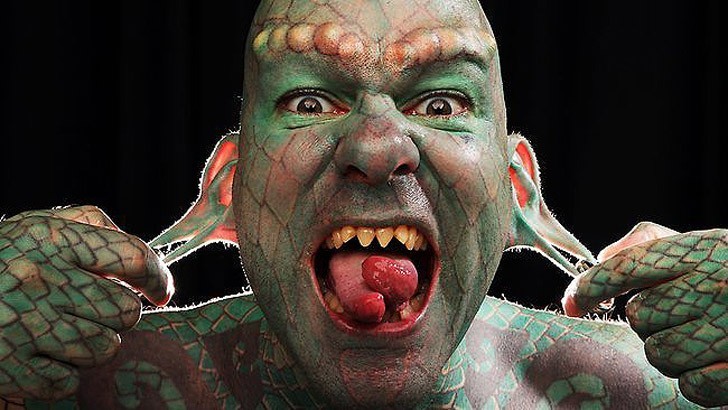 Эрик Спрэг из штата Техас был одним из первых, кто разделил свой язык на две части, а затем провел в общей сложности 700 часов в тату-салоне. Его зубы заточены как клыки, губы покрашены в зеленый, а ноздри и мочки ушей растянуты. По профессии Спрэг - современный перформанс-исполнитель, среди его номеров - глотание огня и сабель.