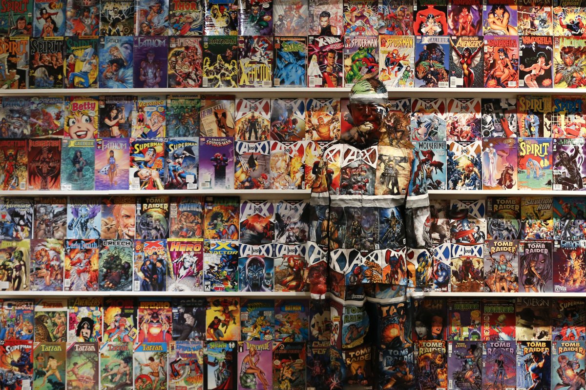 Если присмотреться, вы увидите Лю Болина - китайского художника, известного как "невидимка", слившегося со стендом комиксов.