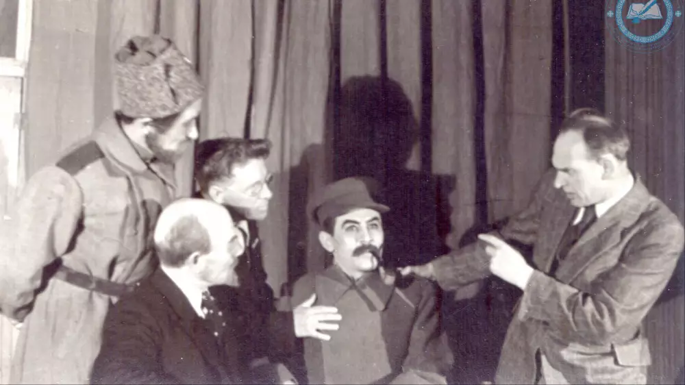 Казахский академический театр драмы. Репетиция спектакля "Человек с ружьем" по пьесе Н.Ф. Погодина в постановке Ю.Л. Рутковского и Ш.К. Айманова (слева направо): Ш.К. Айманов в роли солдата Шадрина, Умурзаков Е. в роли Ленина, Гуськов (гример), Бадыров К. в роли Сталина, Ю.Л. Рутковский. Алма-Ата. 1947 г. ЦГА РК. Ф. 1712. Оп. 1. Д. 61.