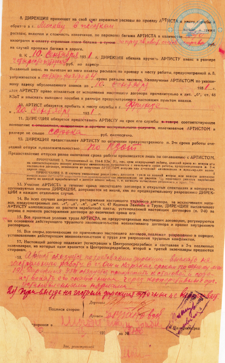 Трудовой договор Ю.Л. Рутковского с Алма-Атинским городским отделом народного образования о приеме на работу художественным руководителем-режиссером русского драматического театра. 1933 г. ЦГА РК. Ф. 1712. Оп. 1. Д. 29.
