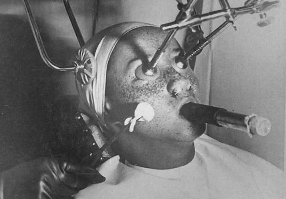 Это вовсе не сцена пыток из фильма ужасов. Такая машина когда-то использовалась, чтобы "заморозить" веснушки при помощи углекислого газа. Глаза и ноздри пациента закрывались герметичными пробками, а дышать во время процедуры нужно было через специальную трубку.