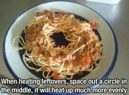 Если вы разогреваете еду в микроволновке, то расположите ее в виде кольца. Так она будет нагреваться значительно равномернее.