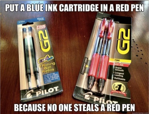 Всем работникам присутственных мест хорошо знакомо волшебное исчезновение ручек. Чтобы прекратить это бедствие, вставьте синие стержни в красные ручки. Красные ручки не воруют!
