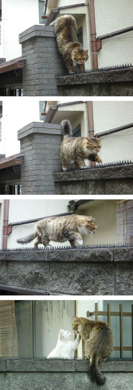 Несмотря на то, что дорогу к любимой преграждали шипы, его это не остановило. Кот смело прошел все препятствия.